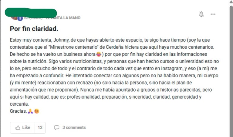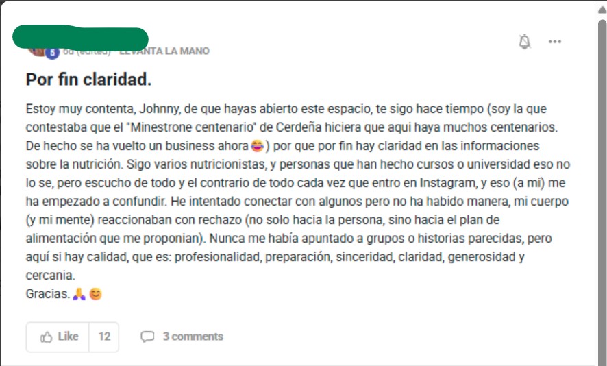 3- Un entorno seguro: Aquí no juzgamos. No hay fanáticos ni polarizados. Solo gente normal compartiendo experiencias, aprendiendo a vivir y comer mejor, basándonos en dos pilares: ciencia y sentido común (y no el influencer vende humo de turno).